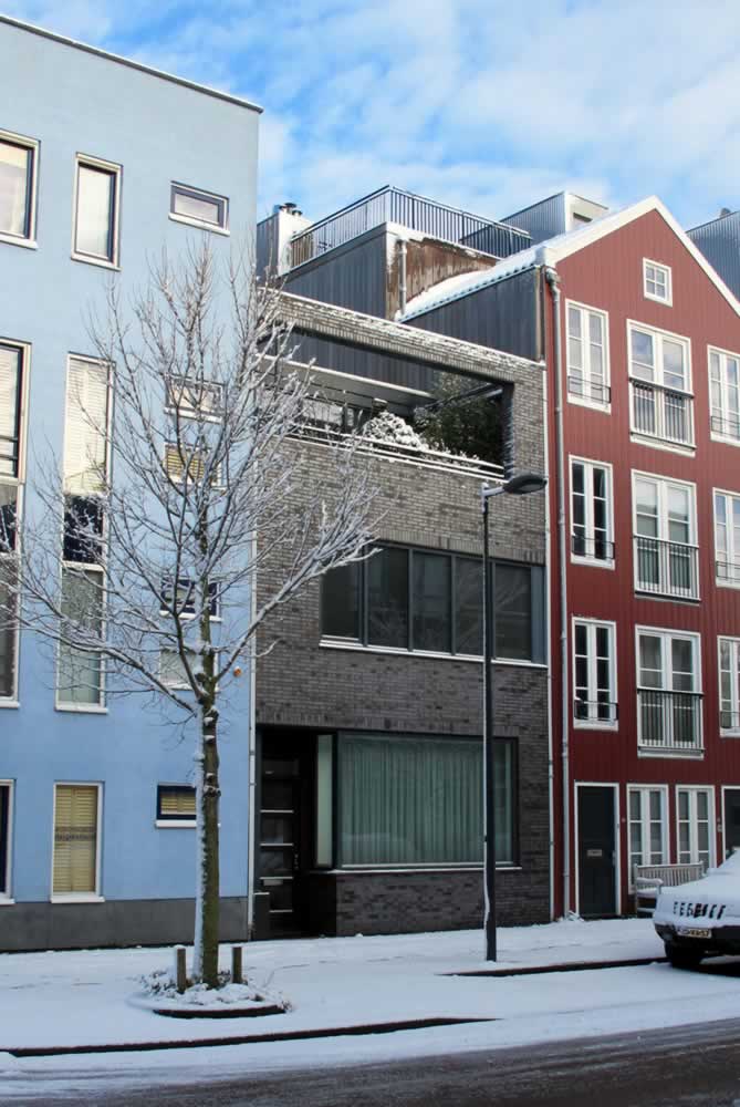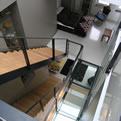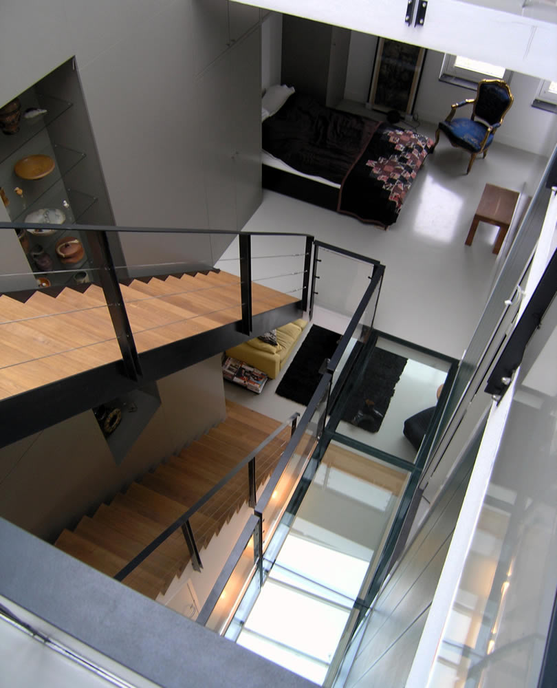 Het hart van de moderne woning vormt het transparante trappenhuis. Door de glazen loopbruggen en de open borstweringen ontstaan lange zichtlijnen en een open geheel.