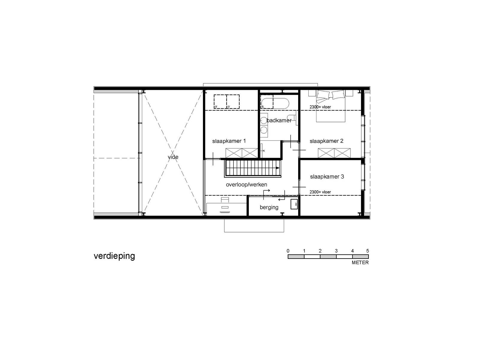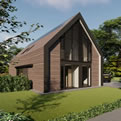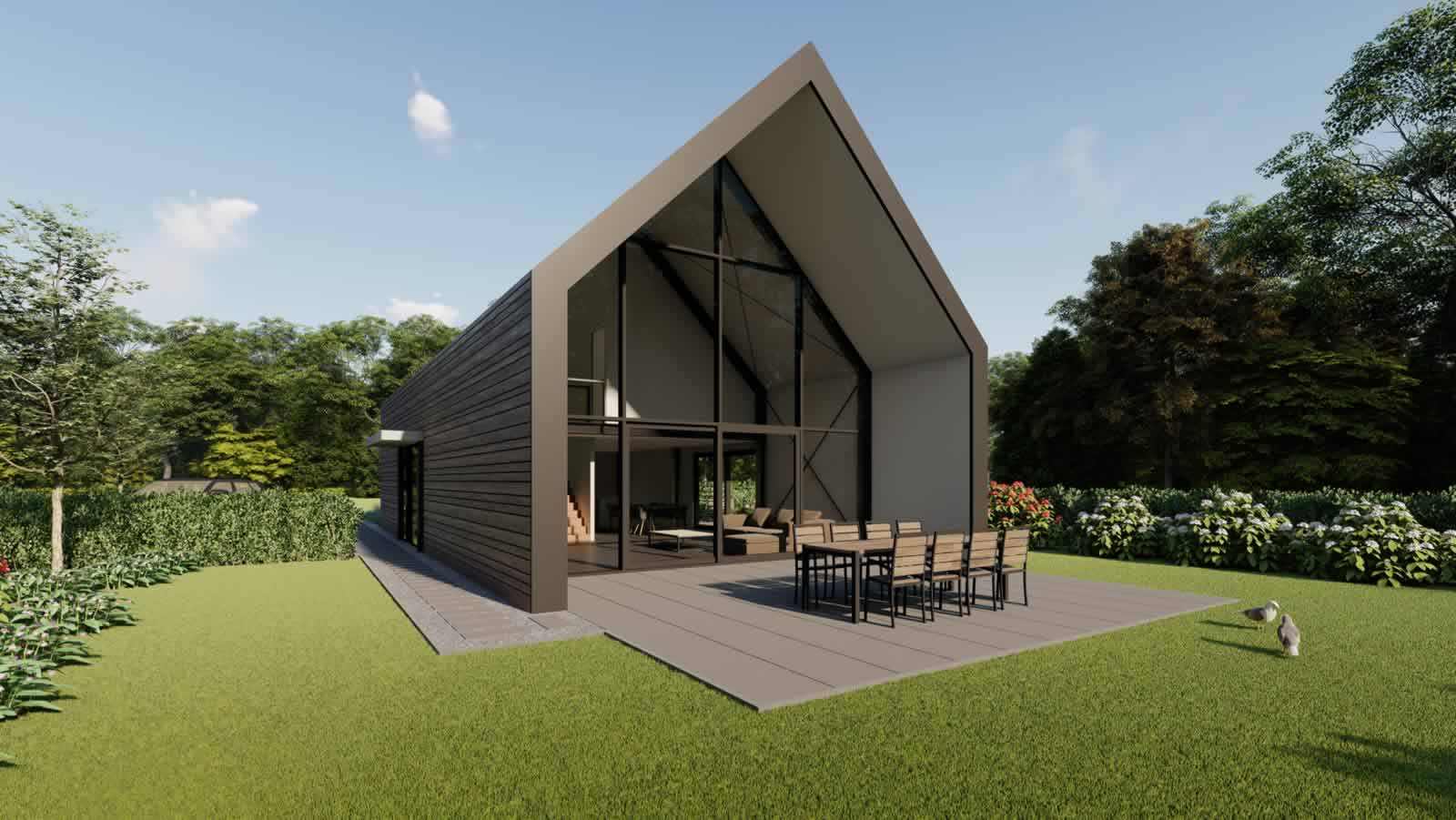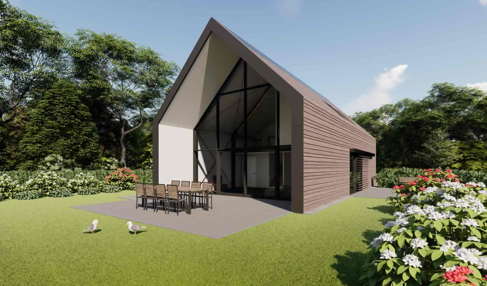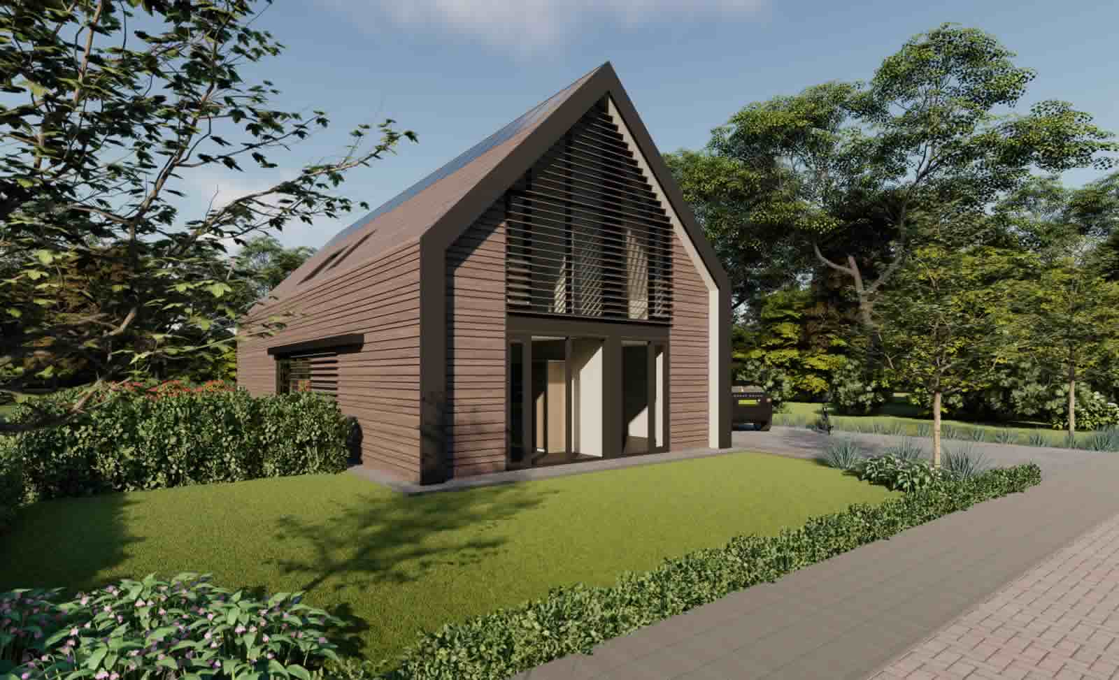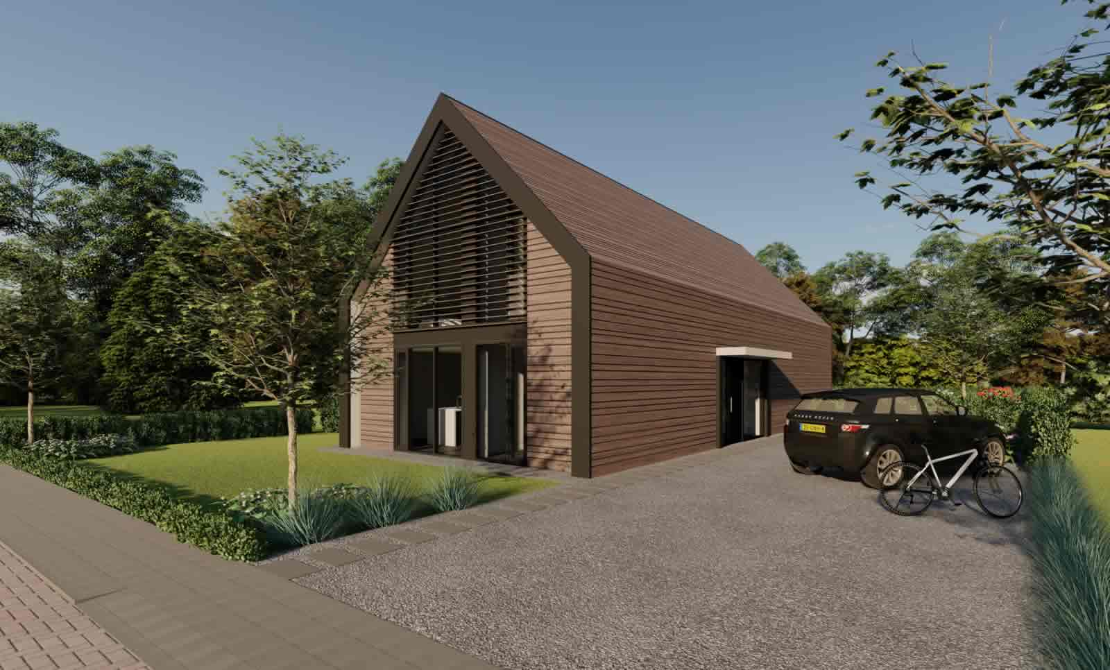 Bij dit ontwerp zijn de lichttoetreding en hoge ruimte kenmerkend en de gevels uitgevoerd met houten delen. Bij de indeling van deze schuurwoning is gekozen om de woonkamer met een vide aan de achterkant te plaatsen en de woonkeuken met een ruim kookeiland aan de voorzijde van de woning. Door de glazen pui met vide aan de achterzijde van de woning ontstaat er een fraaie leefruimte met veel daglicht. Op de verdieping bevinden zich tevens drie slaapkamers en een badkamer.
