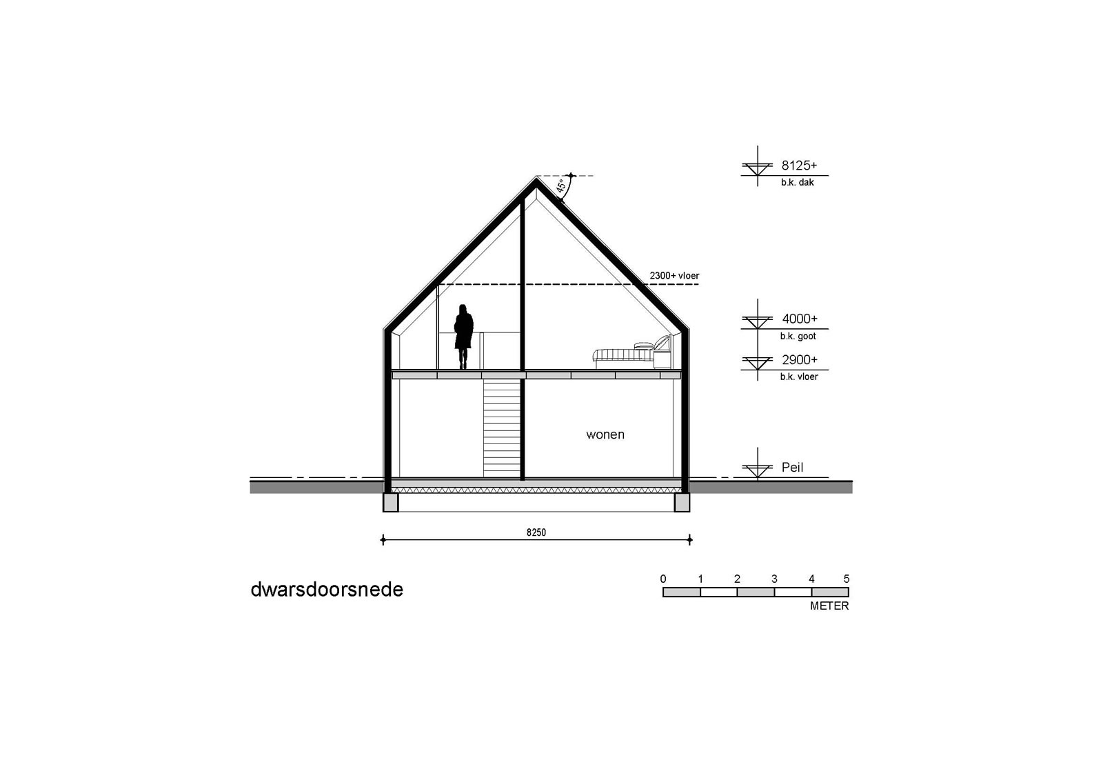 Deze moderne schuurwoning heeft een afmeting van 13,60m x 7,80m tussen de buitenwanden, een goothoogte van 4,00m, een nokhoogte van 8,125m, een BVO (=bruttovloeroppervlak) van 198m2 en een inhoud van 702m3 (exclusief de overstekken van het dak).