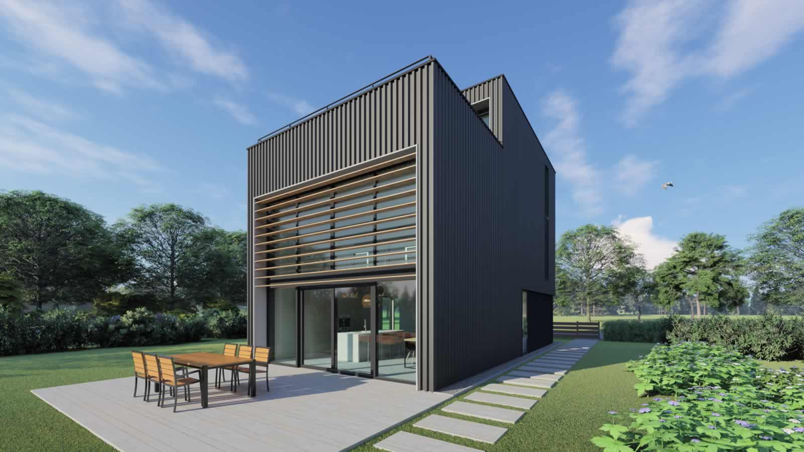 Deze kubistische woning over drie lagen is ontworpen in een stalen bouwsysteem. Ook deze woning heeft door het stalen bouwsysteem een vrije overspanning en geheel vrij indeelbare plattegronden. Door de geringe breedte van de woning is deze woning bij uitstek geschikt voor een binnenstedelijke oplossing, maar is natuurlijk ook op ruimere locaties een optie.