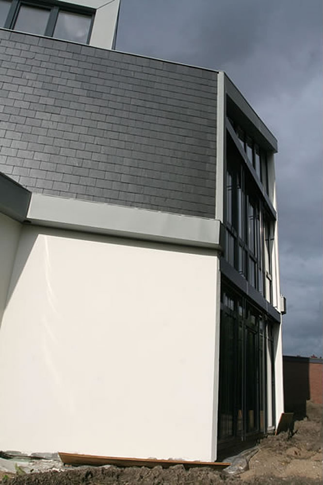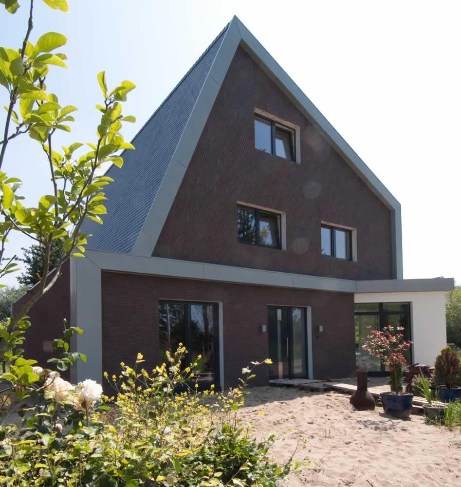 Behalve een woonhuis moest het huis ook een referentiewoning van passief bouwen worden. De woning laat zien wat er zoal aan thermisch brugvrije gevelbekledingen mogelijk is: wit pleisterwerk aan de zuidzijde, gelijmde gezaagde bakstenen in verschillende richtingen aan de noordzijde, leien op de west- en oostgevel en diverse metaalbekledingen voor randafwerkingen.