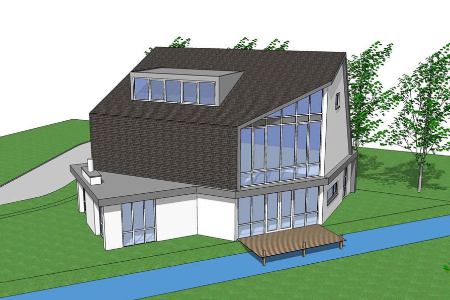 Op het eerste gezicht lijkt de woning geen klassiek passiefhuis. Aan de zuidzijde is veel glas toegepast, met een pui van 9 m1 hoog zonder overstekken. Dit zou een te “Duitse vormgeving” zijn geworden naar de smaak van de opdrachtgever. Om de lichtinval cq. zonnewarmte te reguleren, zijn lamellen toegepast.