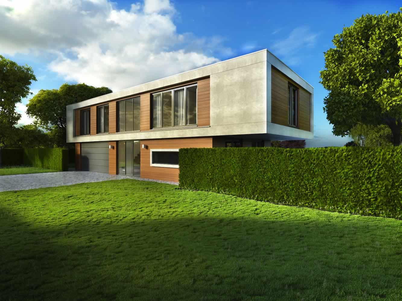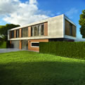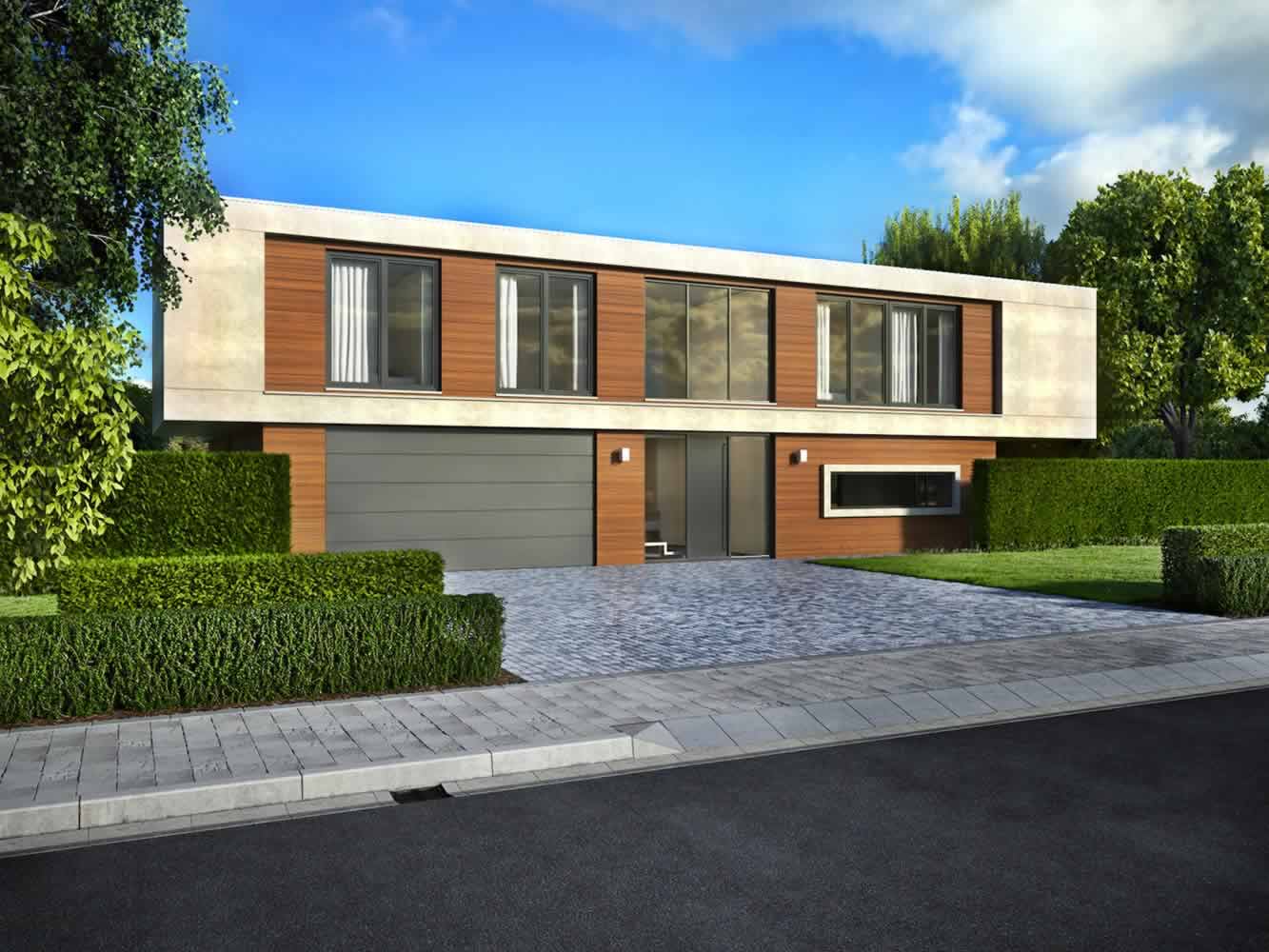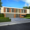 Moderne woning met een stoer karakter. Strakke vormgeving met krachtige uitstraling door het gebruik van robuuste materialen. Prefab beton en onderhoudsarme gevelbekleding met houtmotief benadrukken het ontwerp.