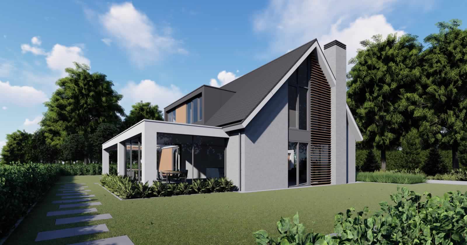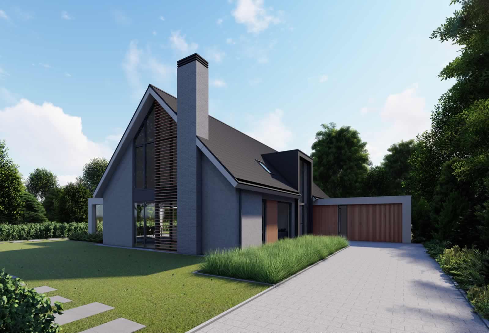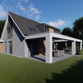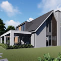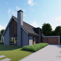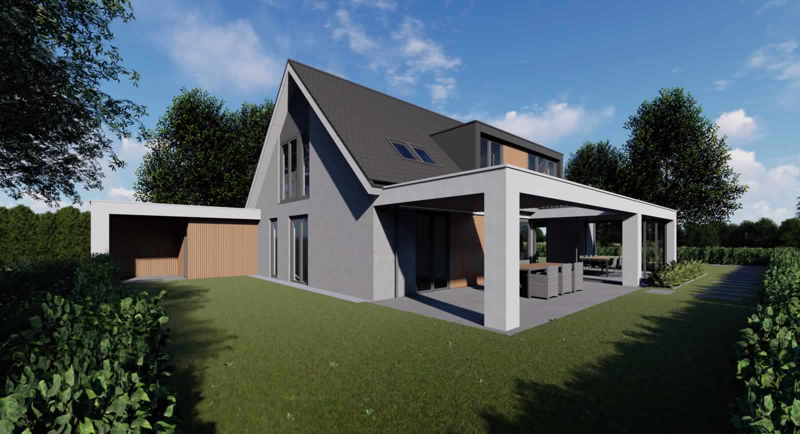 Deze bestaande bungalow met een lage kap uit de jaren 70 is aan de binnen- en buitenkant nog in oorspronkelijke staat. Hiervoor hebben wij een verbouwingsontwerp gemaakt om deze woning te moderniseren en een eigentijdse uitstraling te geven. De bestaande kap wordt vervangen door een beter geïsoleerde kapconstructie. Een grote verticale raampartij tot onder de nok geeft de voorgevel meer uitstraling en benadrukt de nieuwe kaphoogte van de woning. De entree is geaccentueerd door een hoog kader, die aan de binnenzijde voor extra ruimte zorgt, zodat een nieuwe trap naar de verdieping op een betere positie kan komen. De bestaande bakstenen gevels worden geschilderd in een lichtgrijze kleur en de twee moderne aanbouwen worden van wit stucwerk voorzien. De combinatie van nieuwe kleuren en materialen en de toepassing van houten geveldelen, grote puien en houten zonweringslamellen zorgen voor een speels effect en een frisse eigentijdse uitstraling van de woning.