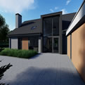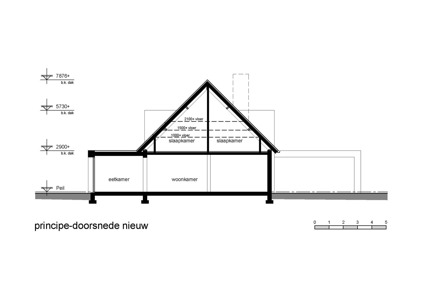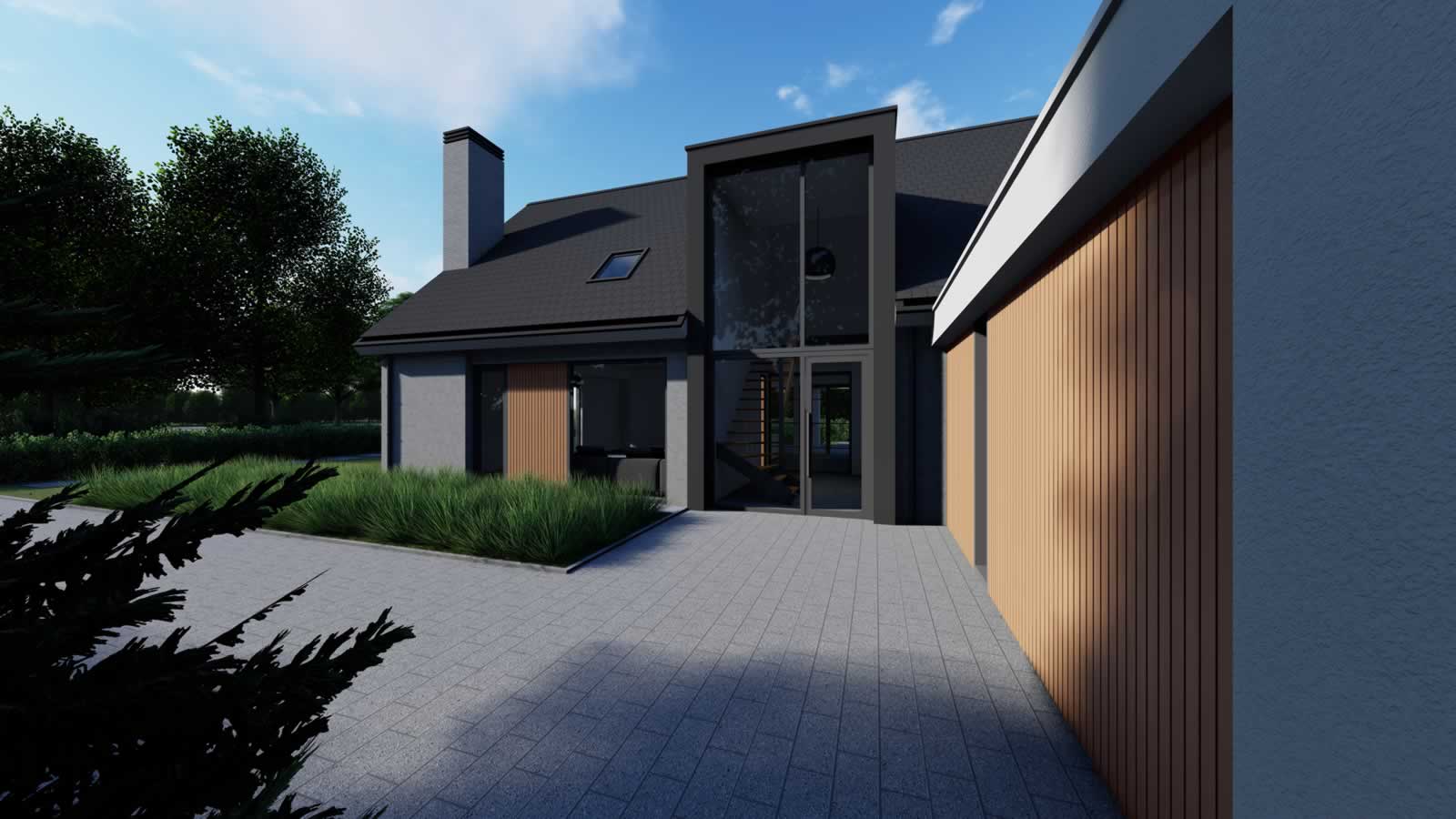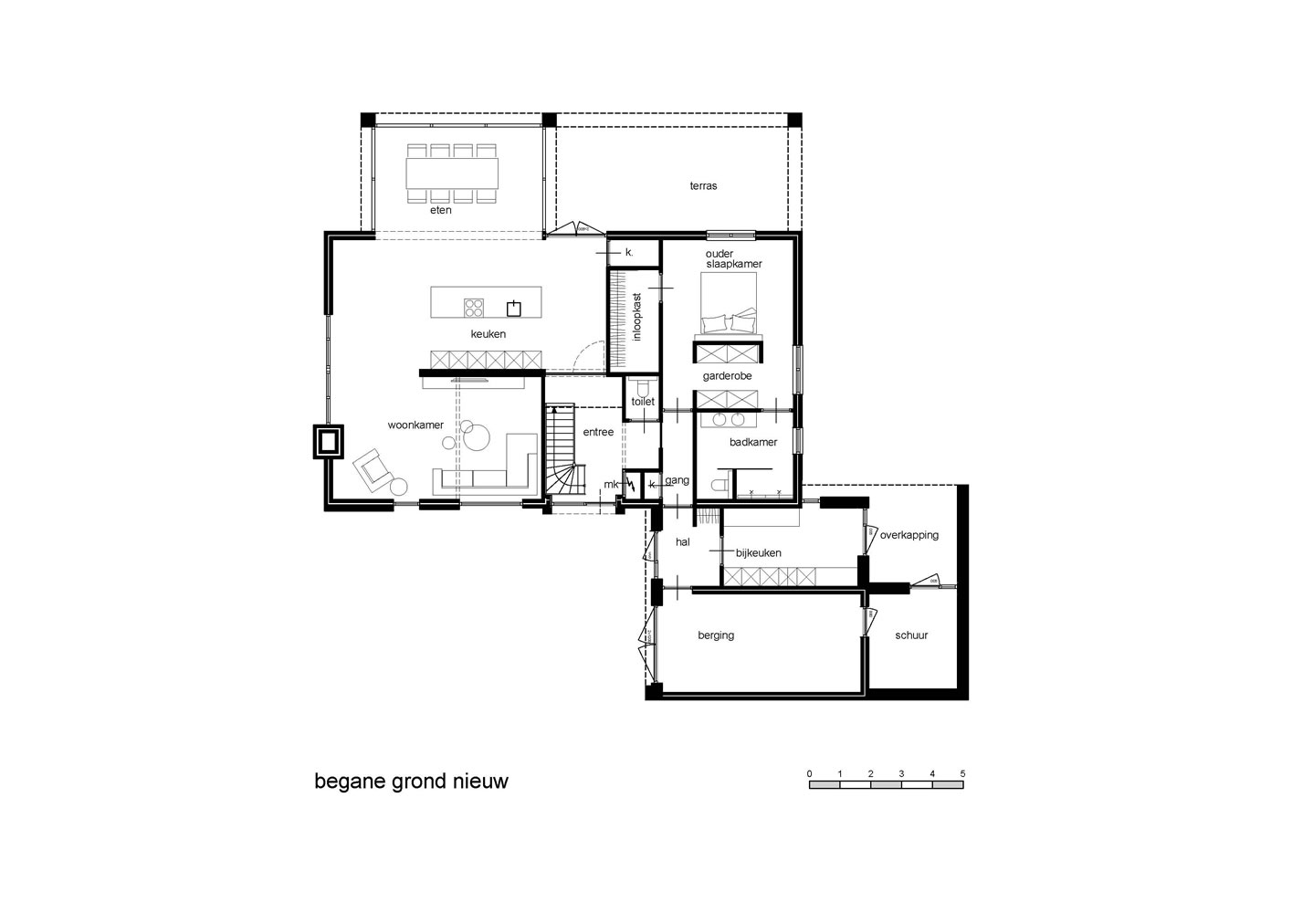 Deze bestaande bungalow met een lage kap uit de jaren 70 is aan de binnen- en buitenkant nog in oorspronkelijke staat. Hiervoor hebben wij een verbouwingsontwerp gemaakt om deze woning te moderniseren en een eigentijdse uitstraling te geven. De bestaande kap wordt vervangen door een beter geïsoleerde kapconstructie. Een grote verticale raampartij tot onder de nok geeft de voorgevel meer uitstraling en benadrukt de nieuwe kaphoogte van de woning. De entree is geaccentueerd door een hoog kader, die aan de binnenzijde voor extra ruimte zorgt, zodat een nieuwe trap naar de verdieping op een betere positie kan komen. De bestaande bakstenen gevels worden geschilderd in een lichtgrijze kleur en de twee moderne aanbouwen worden van wit stucwerk voorzien. De combinatie van nieuwe kleuren en materialen en de toepassing van houten geveldelen, grote puien en houten zonweringslamellen zorgen voor een speels effect en een frisse eigentijdse uitstraling van de woning.
